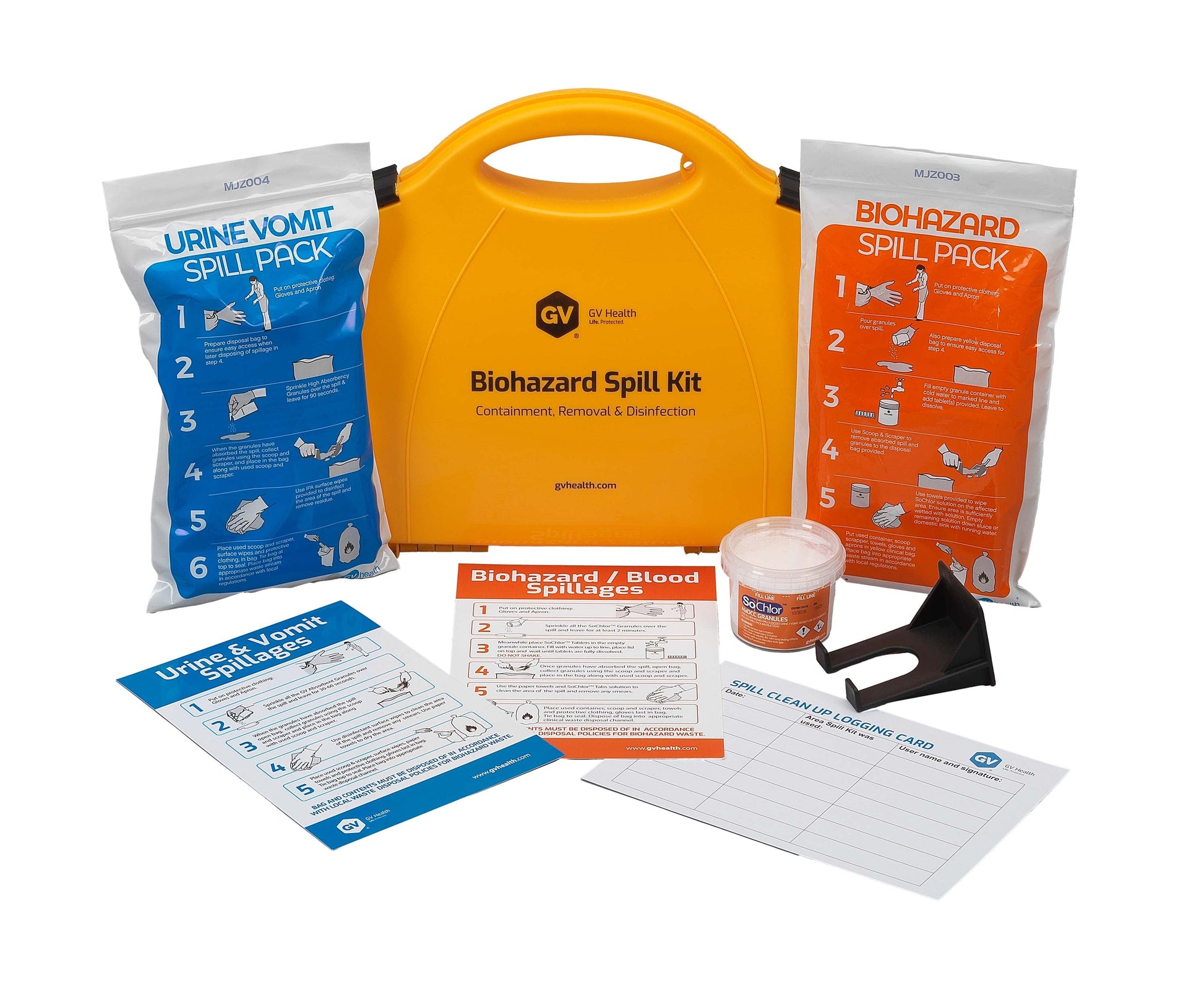Urine and vomit cleaning packs are used to clean and decontaminate areas where spillages of urine and vomit have taken place. The single use pack is supplied with all PPE, GV Biocide Granules and disinfectant surface wipes. GV Biocide Granules are safe to use on acidic spills and have a high absorbency to mass ratio with 100g absorbing up to 7 litres of liquid. GV Biocide Granules ensure easy collection and removal of a urine or vomit spill and contain Triclosan an organic anti-bacterial agent. Disinfectant wipes are provided to wipe down the surface and surrounding area where spillages have occurred and remove any remaining residue. The small pack makes it easy to keep ready for use in all areas and ensure accessibility where it may be needed.