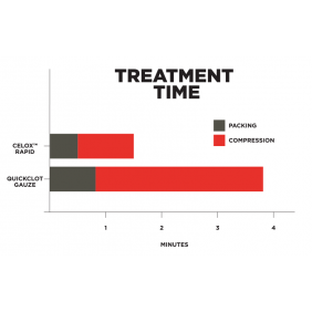 The current generation of hemostatic agents need at least 3 minutes of compression to work. Celox RAPID Gauze removes the delay by speeding up packing time and reducing compression time to just 60 seconds while using the proven haemostat technology of Celox.