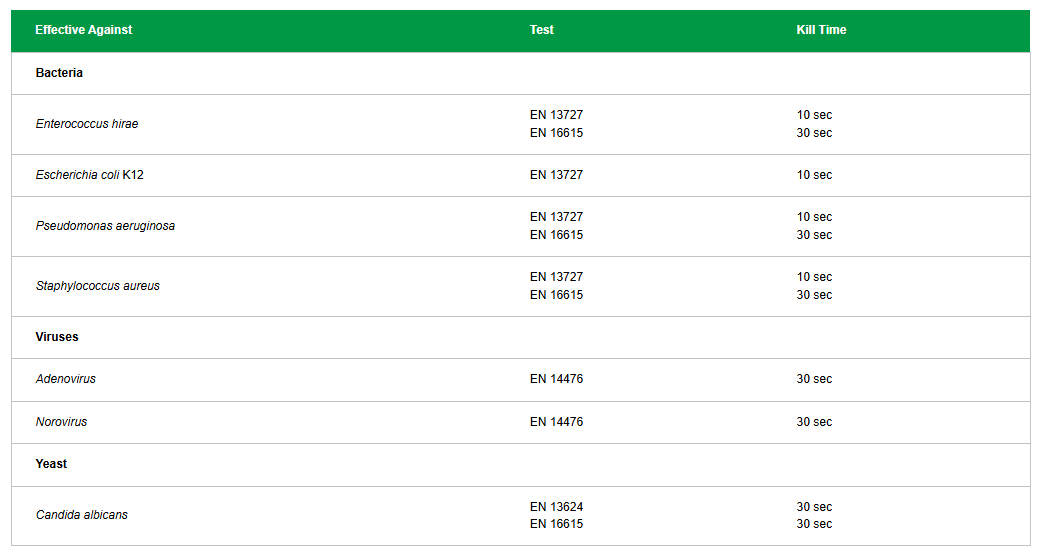 | Escherichia coli K12 | EN 13727 | 10 sec |