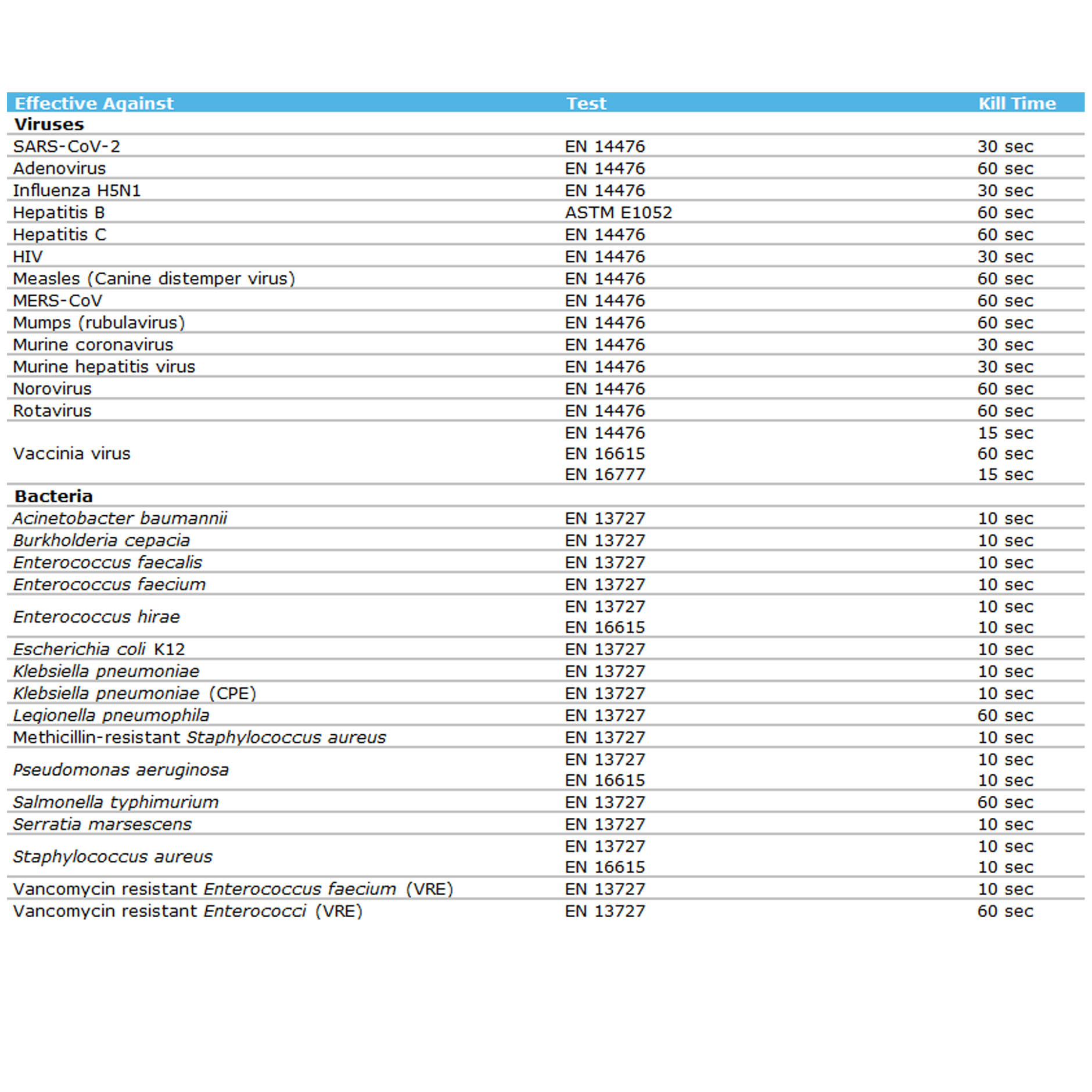 Acinetobacter baumannii | EN 13727 | 10 sec |