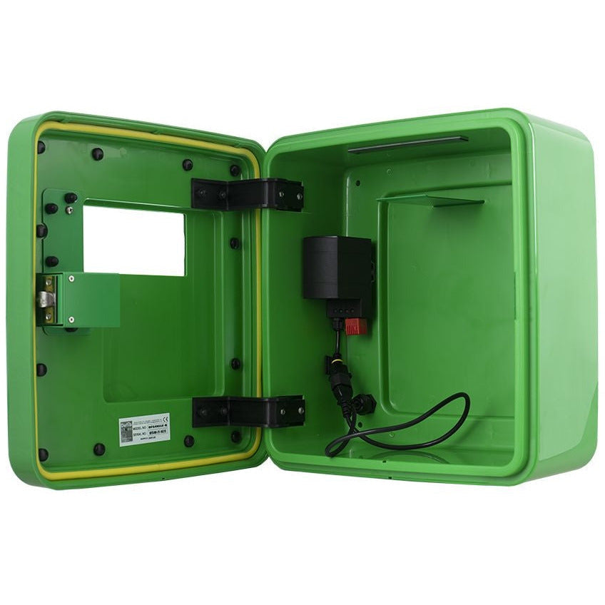 This Green polycarbonate Defib Store 4000 includes a thermostatically controlled heater, motion sensored light and marine grade stainless steel keypad lock.