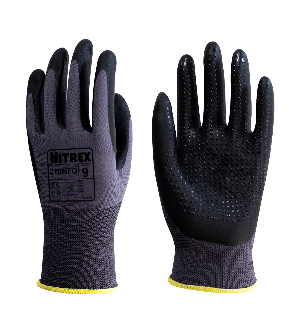 These versatile black gloves have a foam coating overlaid with nitrile grip dots on a breathable, light weight 15 gauge liner. The foam nitrile coating helps to wick away moisture from the palms and fingertips, allowing for superior grip in wet and oily conditions. The nitrile grip dots, which coat the outer of the glove work to further enhance grip; allowing Nitrex 270NFG flex grip work glove to keep hands and materials safe in some of the most challenging working conditions.