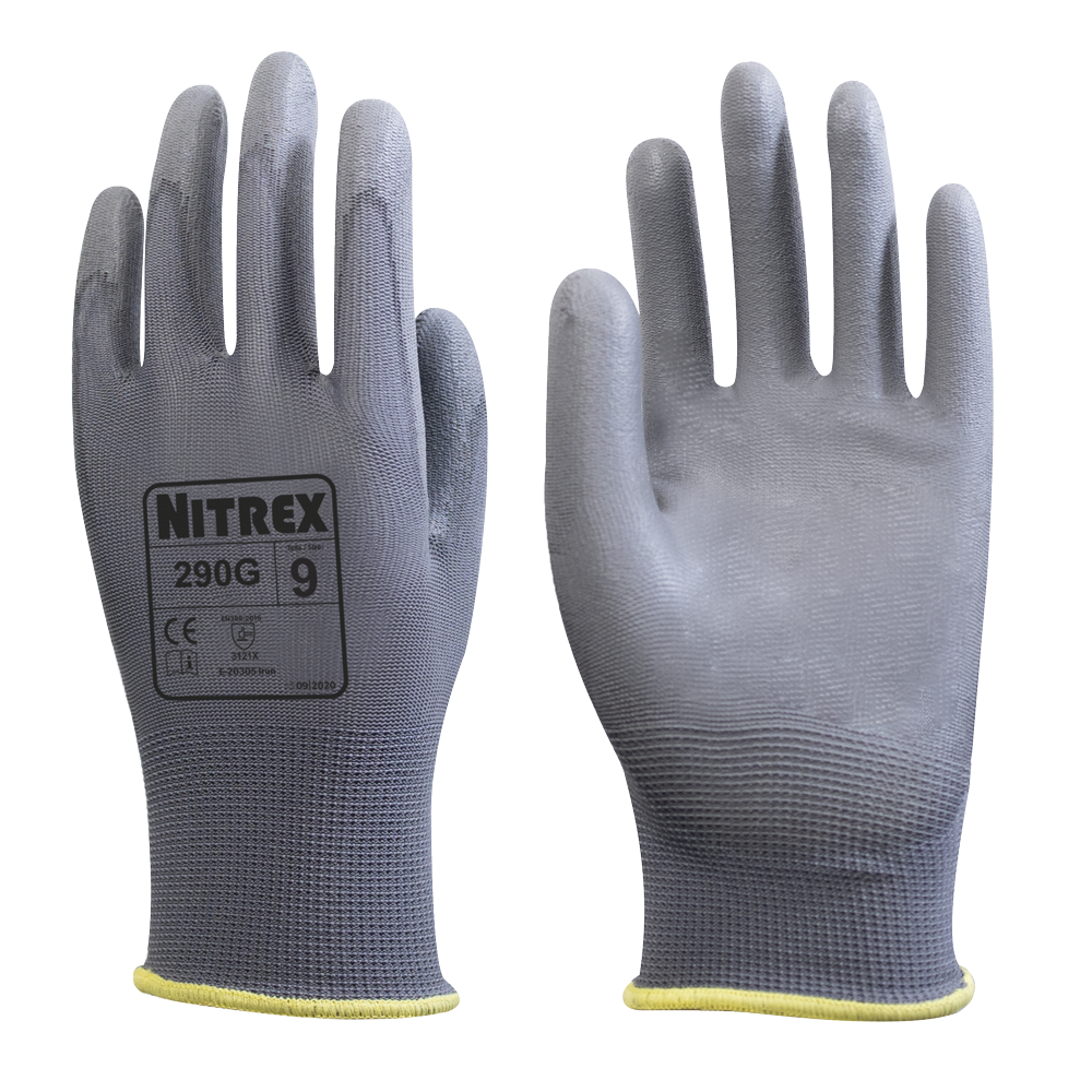 Our Nitrex 290B / 290G PU palm coated gloves are ideal for fine handling tasks thanks to their form-fitting and flexible construction. Featuring a polyurethane (PU) coating and medium weight polyester close-fit design, these gloves allow for unimpeded dexterity, whilst offering fantastic abrasion resistance for enhanced safety. Not only is the medium weight polyester design incredibly comfortable to wear – helping to reduce fatigue and maintain productivity – it is also fully breathable. This means reduced perspiration and an improved grip. This exceedingly comfortable glove offers wearers the best in functionality, durability, and protection.