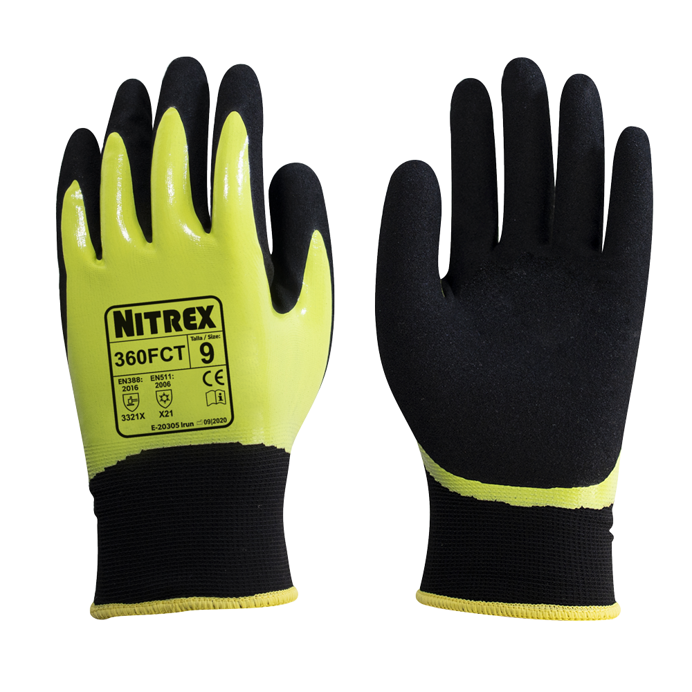 Nitrex 360FCT Thermal Work Gloves offer thermal protective properties, abrasion and cut resistance, hi viz yellow for enhanced visibility, and superior grip, thanks to our Unigloves NitreGrip Technology. The 360FCT is also suitable for use in food applications.