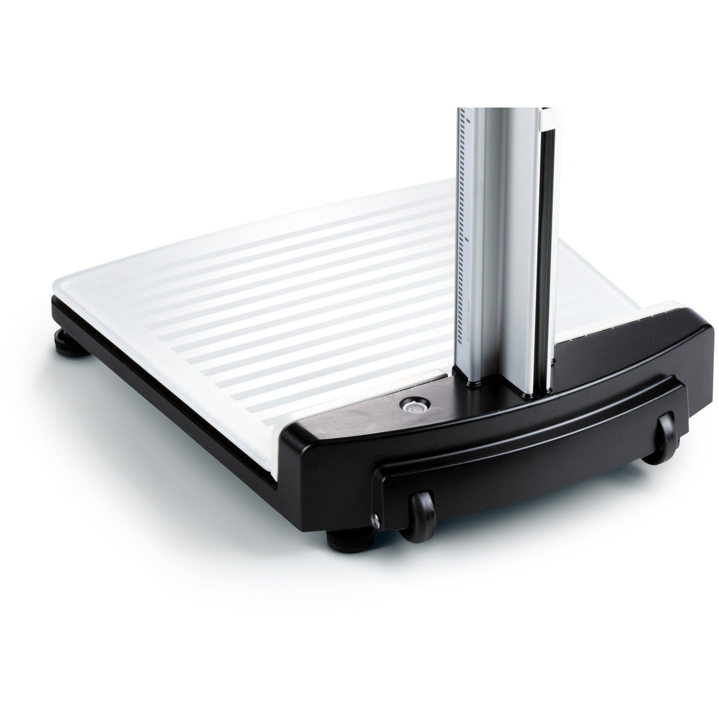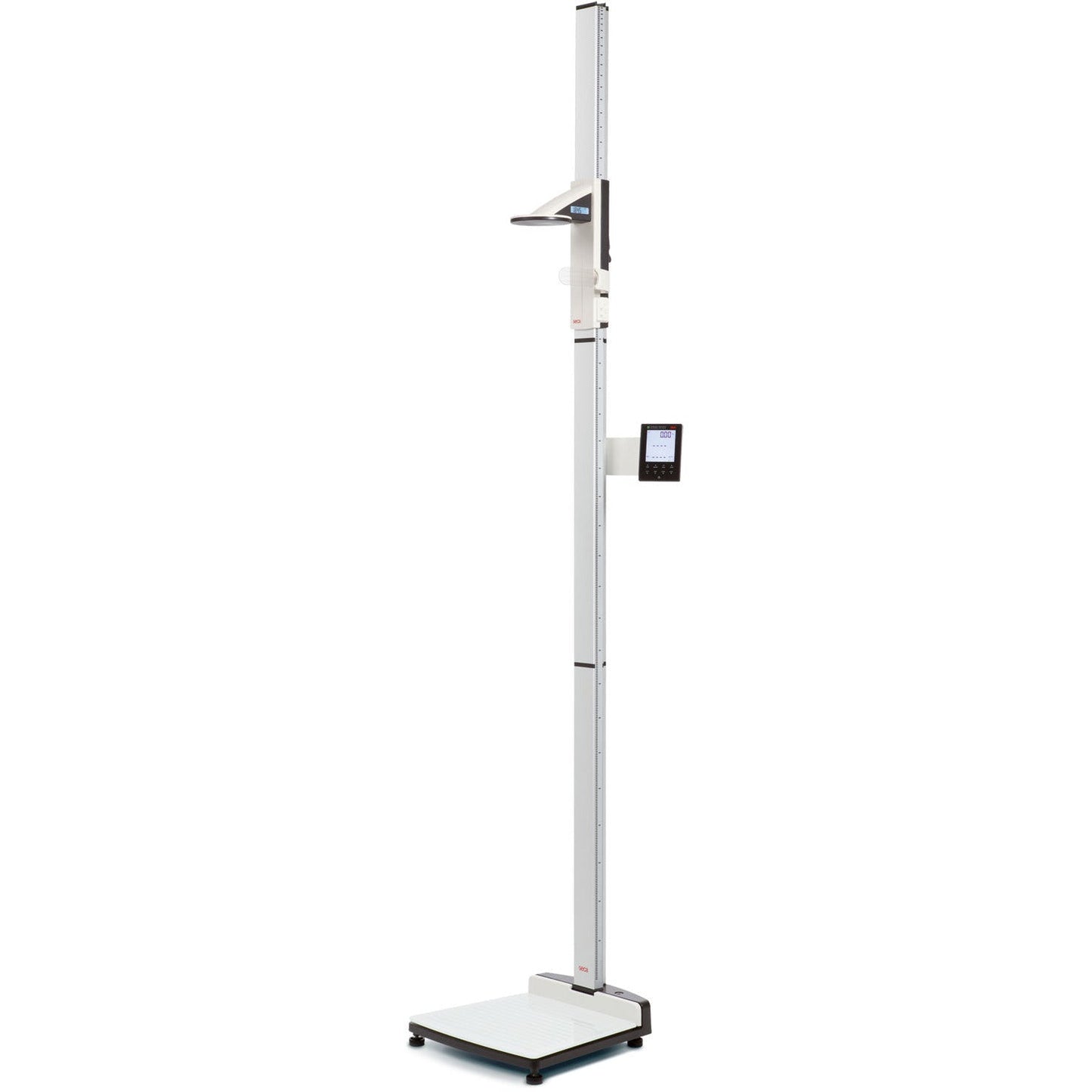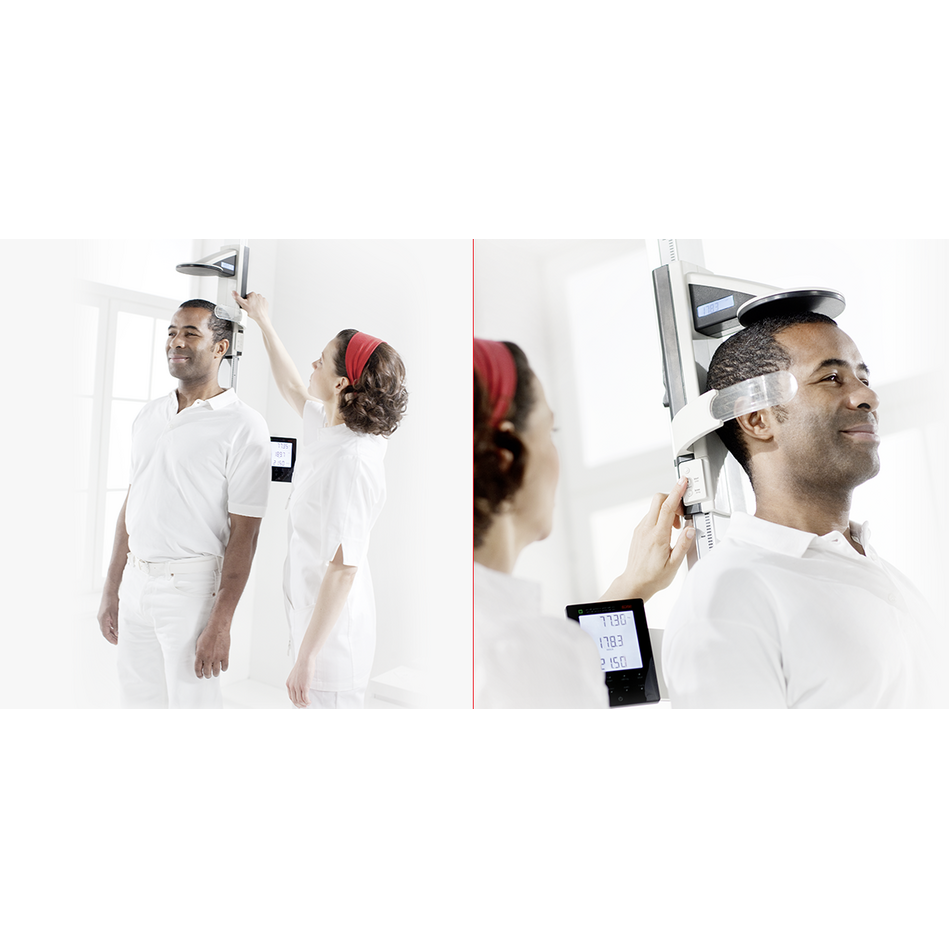 The 360° wireless measuring station seca 285 weighs and measures in a single step. Other benefits include the high capacity scale integrated in a stable glass platform, the heel positioner and the solid headpiece with the integrated seca Frankfurt Line – for precise head positioning. Not to mention the two displays. One is for a direct read-out of height from the headpiece and the other, a three-line multi-function touch display, shows weight, height and the automatically calculated BMI. On top of all that, the scale shows the slightest weight changes with its fine 50-gram graduation and transmits all measurements via the seca 360°