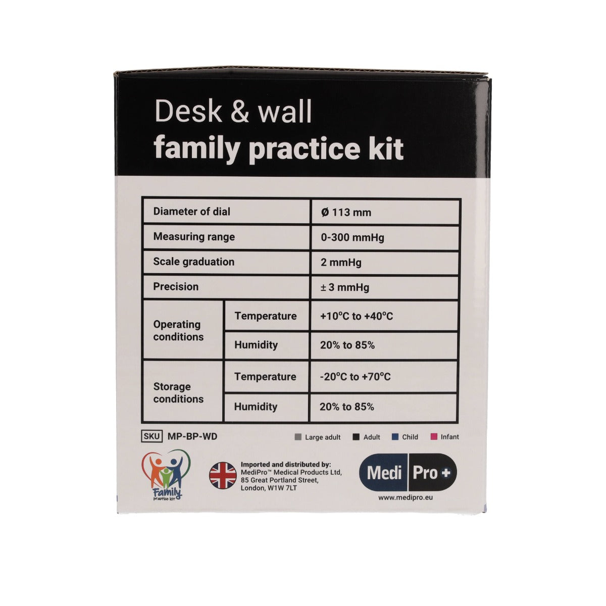 Innovative wall and desk aneroid sphygmomanometer for family practice – an all in one practice kit, with four cuff sizes and handy rear basket for cuff storage.