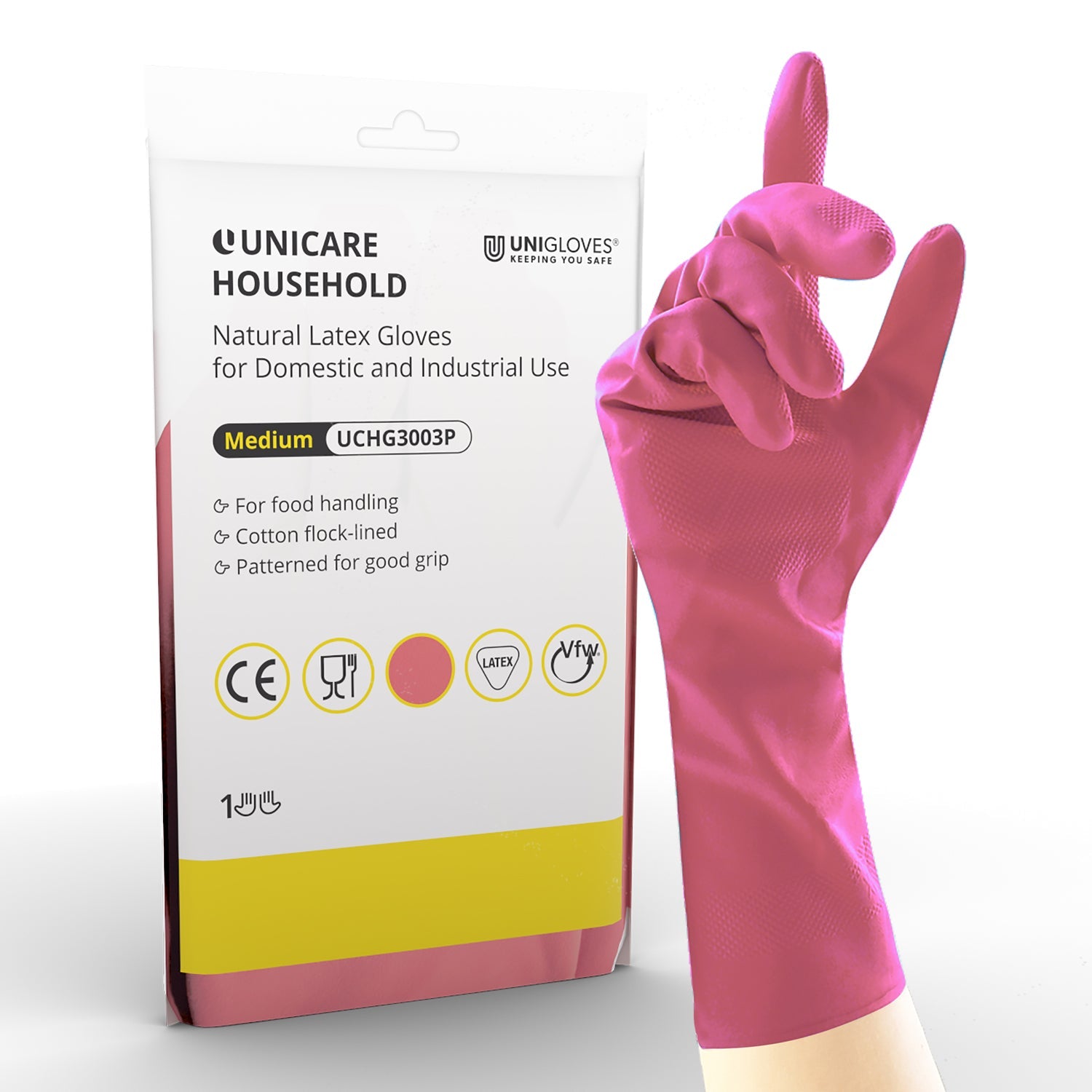 Unicare household gloves offer enhanced barrier protection with a beaded cuff and a raised grip pattern for superior grip. A grip that works for glove users improves their performance and increases workforce motivation in terms of correct glove usage, improving their safety and your compliance. The rubber exterior locks out water and chemicals and helps protect against harsh cleaners, strong detergents, animal fats, alcohols, and detergents. The interior of the glove incorporates a flock lining that helps keep hands dry, making them perfect for dish-washing, cleaning, and other applications.