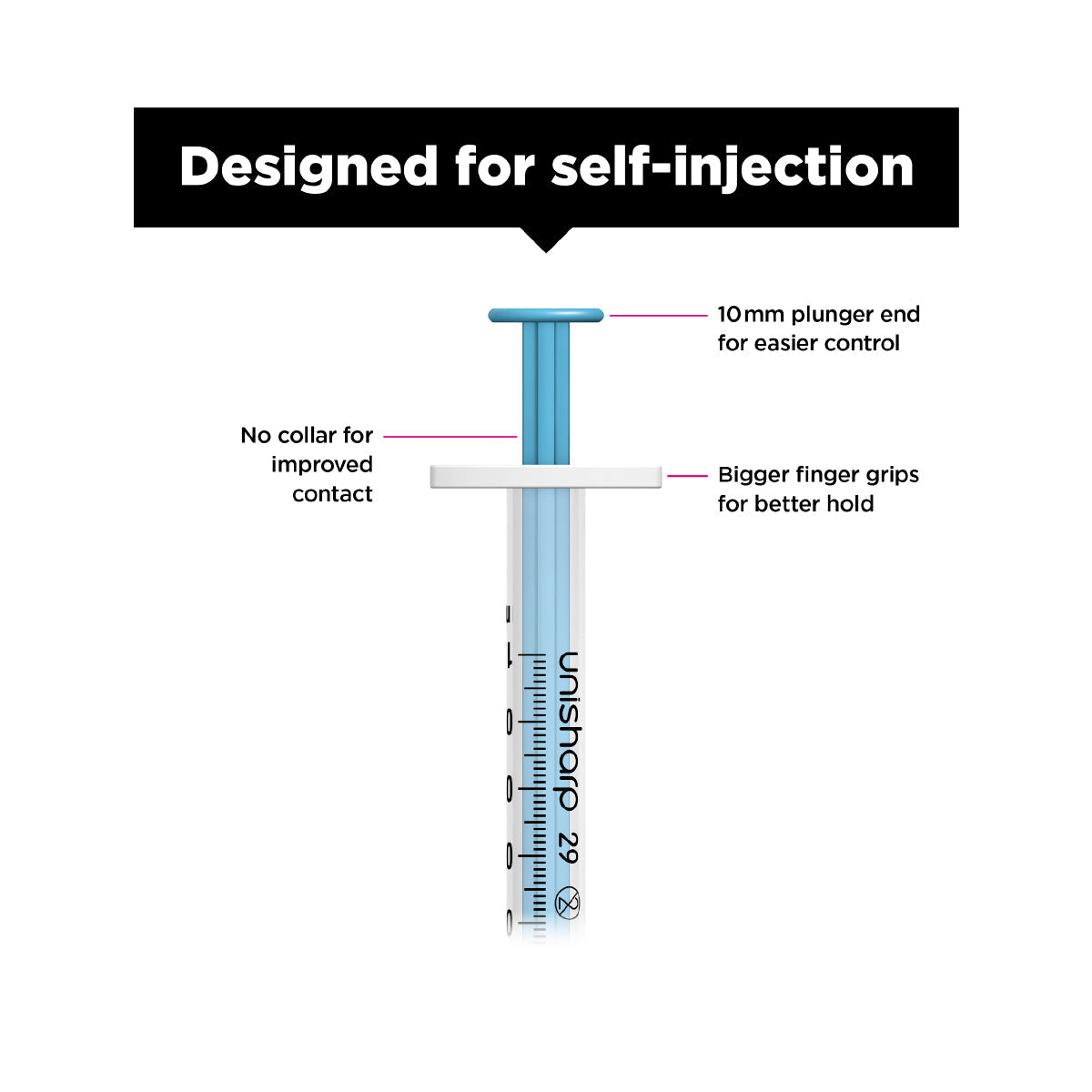 The 29G needle is strong for injection through scarred or tough tissue, and fine for reduced discomfort during injection.