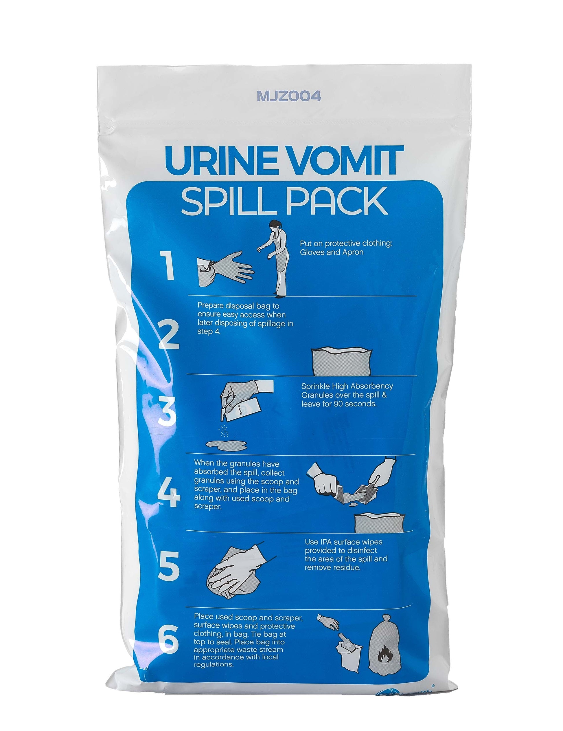 Urine and vomit cleaning packs are used to clean and decontaminate areas where spillages of urine and vomit have taken place. The single use pack is supplied with all PPE, GV Absorbency Granules and Anti-bacterial disinfectant surface wipes.