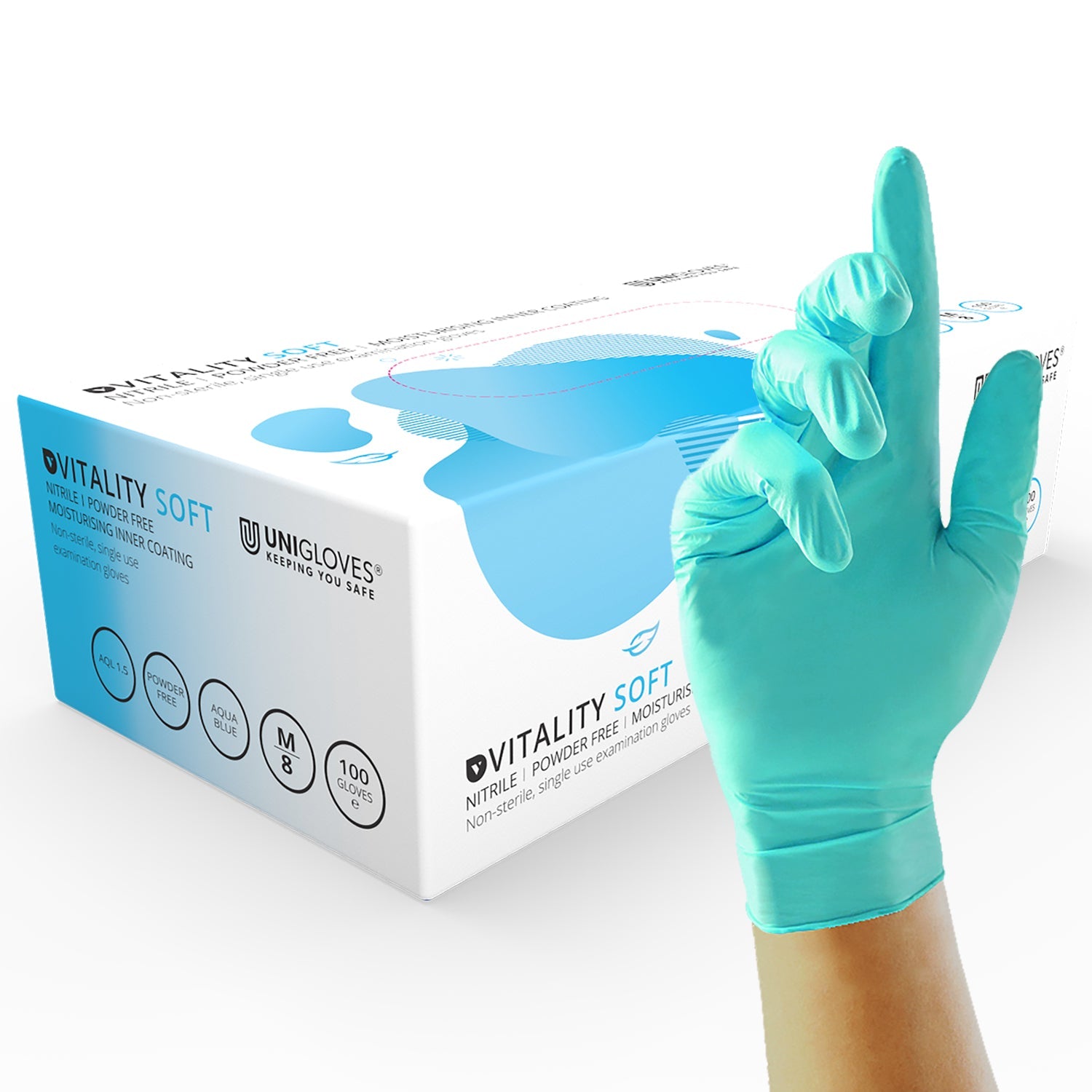 Moisturising, aqua blue, medical grade, light weight nitrile examination gloves, washed offline for a softer, more comfortable finish